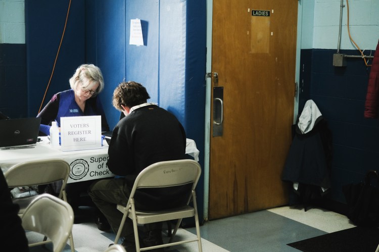Election worker Amy Knepper helps to register a new voter just before noon at the Bow Community Center.